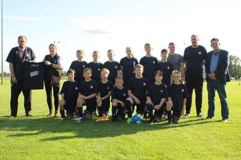 Die JSG D2 bekommt neuen Aufwärm T-Shirts überreicht
