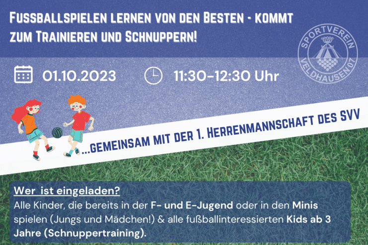 Am 01.10.2023 sind alle Kids von den Minis bis zur E-Jugend eingeladen am Training mit den Spielern aus der 1. Mannschaft teilzunehmen - egal ob ihr schon Fußball spielt oder nicht!